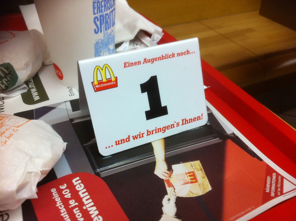 In den allermeisten Fällen werden die Burger noch fertig gebraten oder belegt und dann an den Tisch gebracht. Bis diese Zeit vorüber ist, erhält man ein kleines Schildchen, welches die Bestellung zuordnet. Auch auf Apfeltaschen oder Burger mit Sonderwünschen wie extra Käse oder keine Gurke benötigen meist eine zusätzliche Zubereitungszeit. Doch heute war das irgendwie anders. Während McDouble, Cheese- und Chickenburger sofort verfügbar waren und direkt auf dem Tablett landeten, mussten wir auf etwas anderes warten: auf die Pommes!